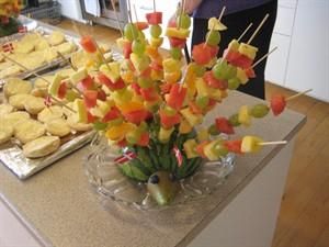 Her bliver der serveret rugbrødsklapper og/eller hjemmebagte boller, frugt og grønt osv.